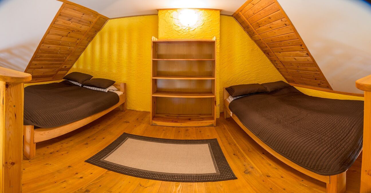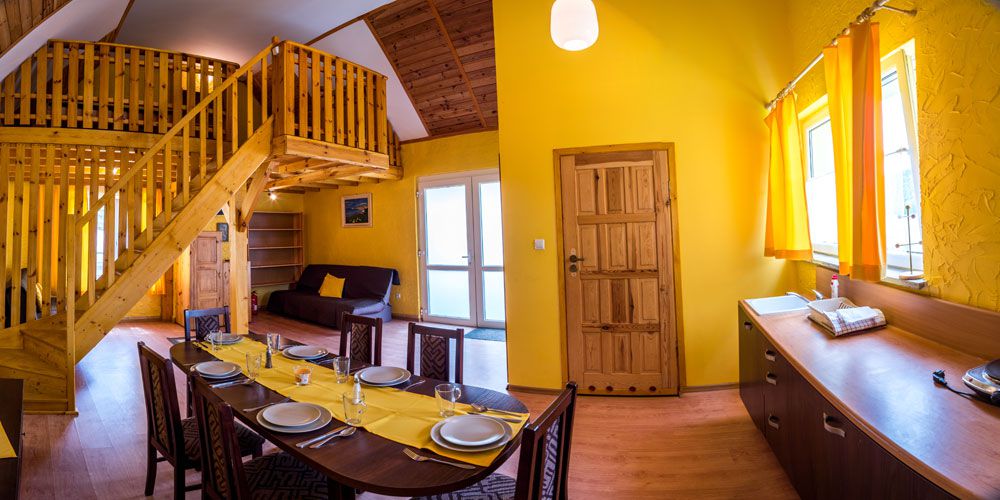Dwa łóżka małżeńskie zostały umieszczone na drewnianej antresoli, a dwa znajdują się w salonie połączonym z kuchnią.